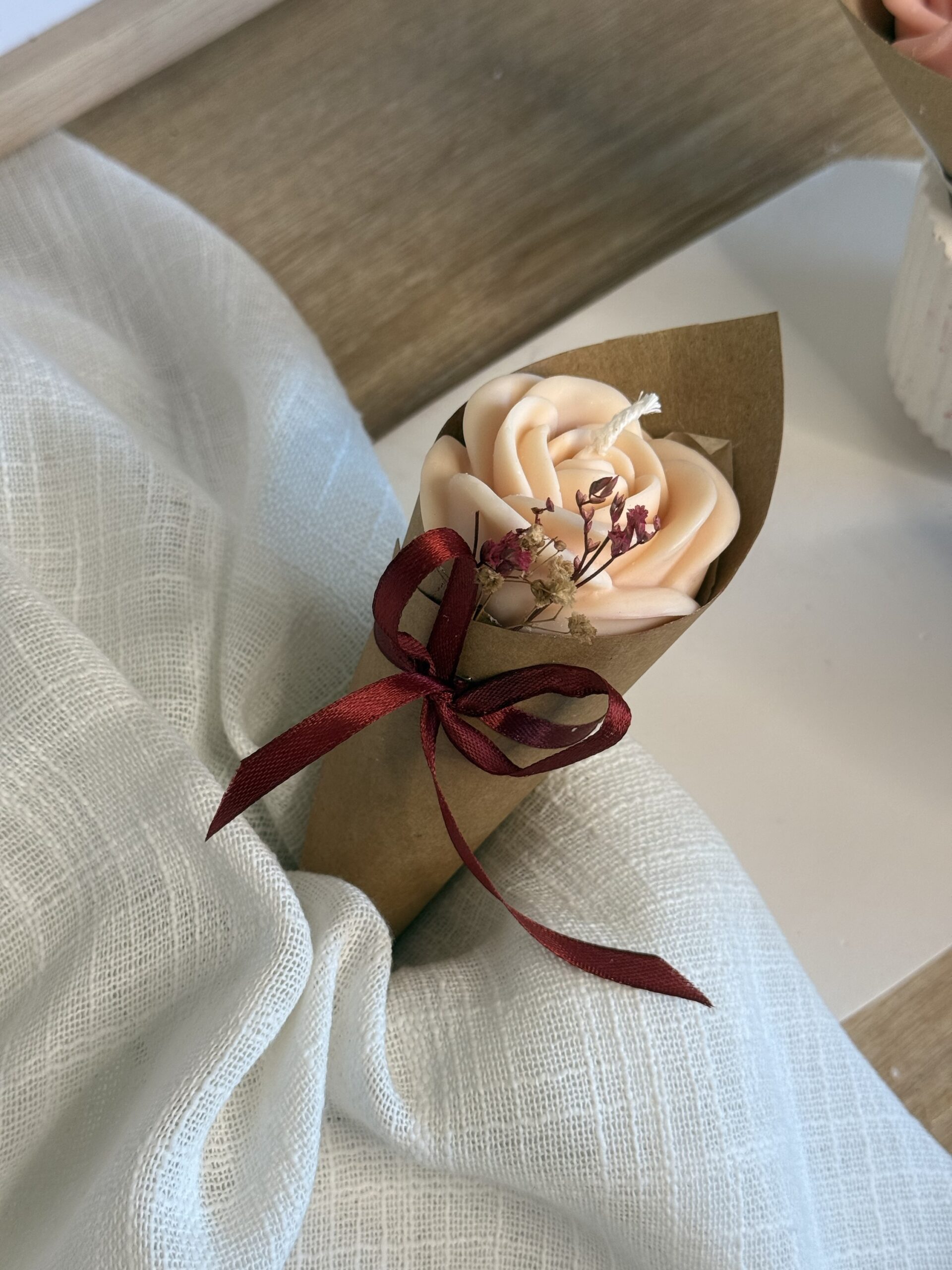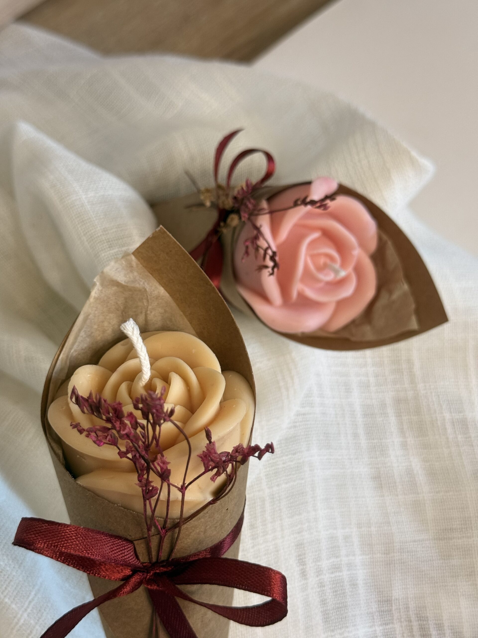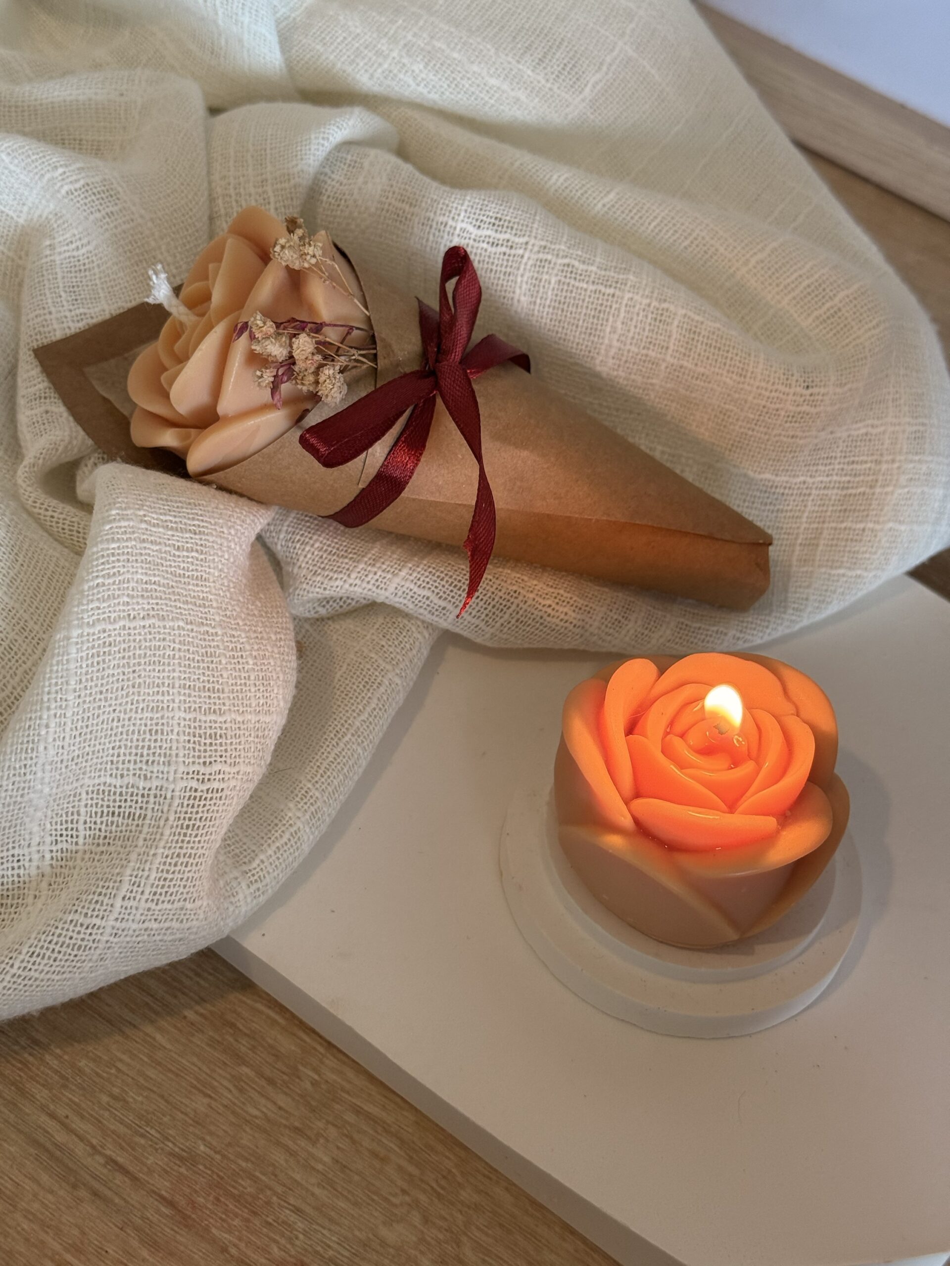 Bougie à la cire de soja, en forme de fleur.